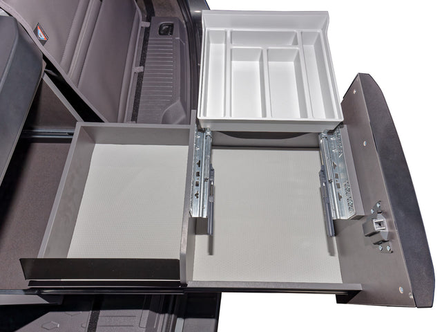Lieferumfang: Antirutsch-/Schutzmatten-Set, 2-teilig, einlegefertig für die Schubläden im Küchenblock der VW T7 California Beach Camper (optional: Beach Tour) und VW Caddy 5 California.